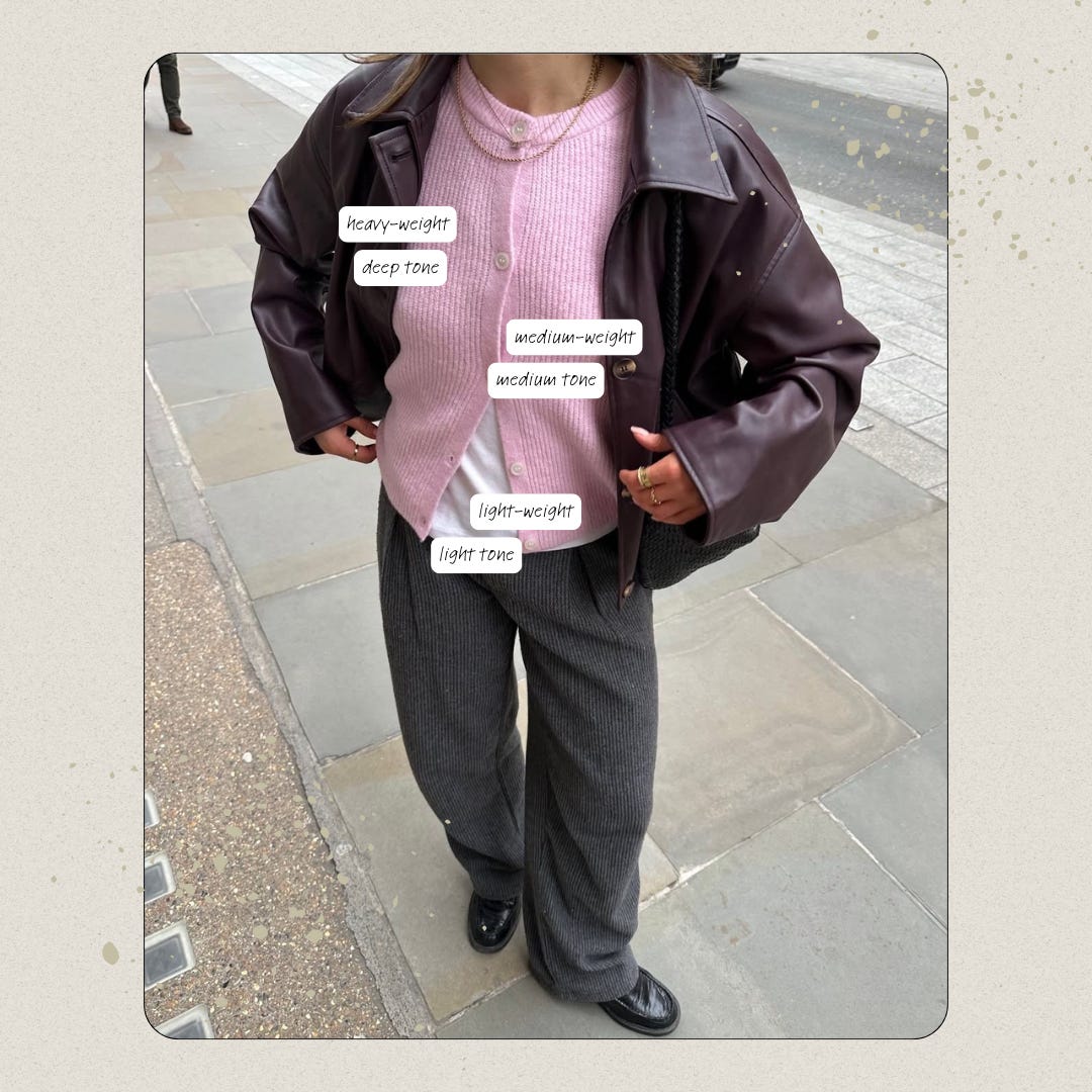 If you want to follow this method closely, start with the lightest layer—both in weight and tone—then move to the medium, and finish with the darkest and heaviest. However, fashion isn’t math. Dare to play around a little and see what works best for you. Once you understand the balance, you can bend it however you like!