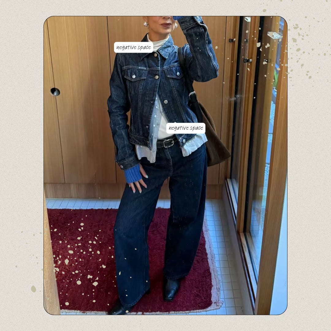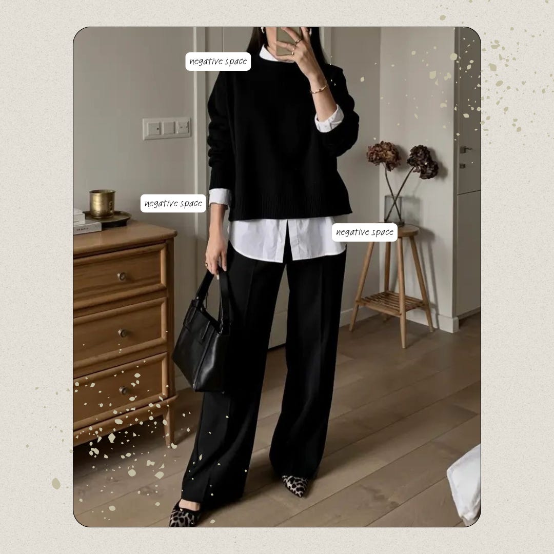Now translate that to your closet. Your clothes are the elements, and those little peeks—the cuff sticking out, the shirt hem showing, a jacket left just slightly open—that’s your negative space. It’s the perfect layering hack because it gives your outfit breathing room and keeps everything from looking too crowded or too messy!