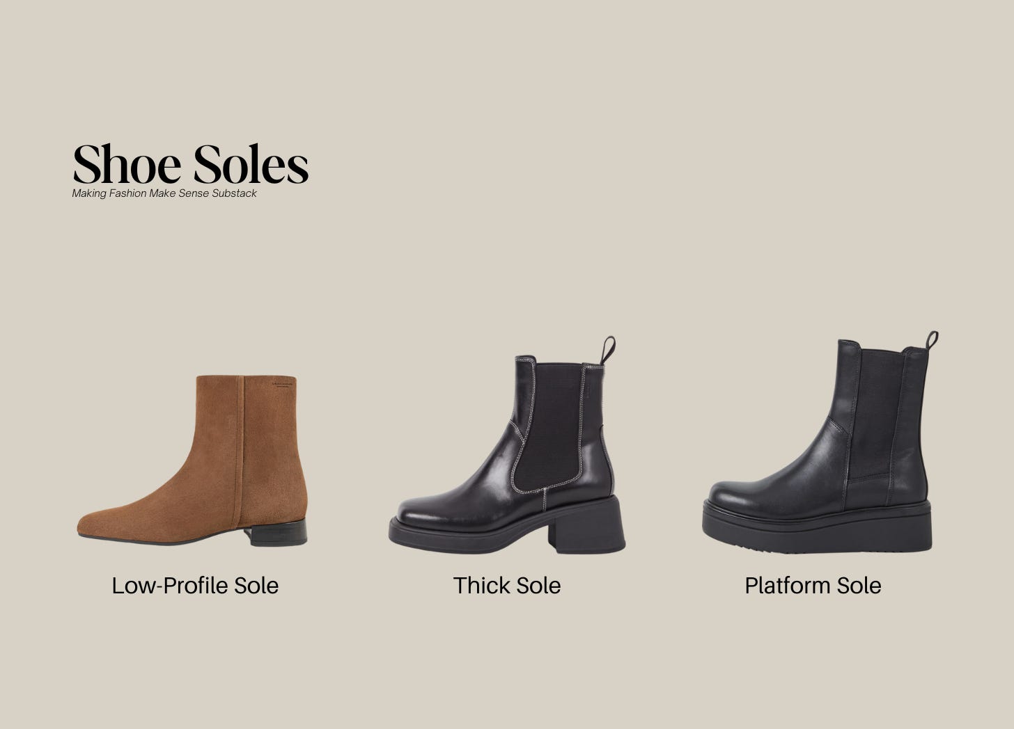 Low-Profile Soles: For a sleek, streamlined look, low-profile soles are my top pick! They pair well with more formal outfits and give off a refined, polished vibe. These are great for spring when you want something lighter and more versatile.